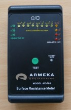Resistanssialue on 103-1012 Ω ja resistiivisyysalue 103 - 1012 Ωm ja mittausjännite on 10V tai 100V. |  | ESD-resistanssimittalaite (AE-760) ARMEKA AE-760 resistanssimittari on analoginen ESD-resistanssimittari, jolla on helppo ja nopea tehdä EPA:n (ESD Protected Area) maadoitusresistanssin, yhdistelmäresistanssin ja point to point –resistanssin tarkistusmittaukset lattioille, pöydille, hyllyille jne.
